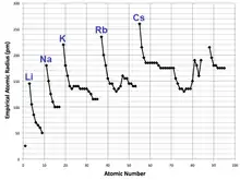 عنصرهای واسطه از الگوی کلی تغییرات شعاع اتمی پیروی نمیکنند. در آغاز پر شدن لایهٔ d شعاع اتمی کاهش مییابد که نرخ آن از نرخ کاهش عنصرهای گروه ۲ نسبت به گروه ۱ بسیار کمتر است؛ ولی در اتمهای انتهایی، روند افزایشی وجود دارد.[31]