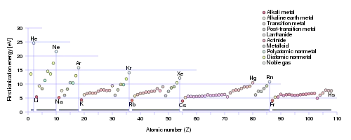 نخستین انرژی یونش، انرژی لازم برای جدا کردن سستترین الکترون از یک اتم خنثی در حالت گازی است. دومین انرژی یونش، انرژی مورد نیاز برای جدا کردن دومین الکترون از یک اتم است. انرژیهای یونش مراتب بالاتر نیز به همین ترتیب تعریف میشوند. برای یک اتم مشخص، با افزایش درجهٔ یونش، انرژیهای یونش متعاقب هم افزایش مییابند. بر الکترونهای لایههای نزدیکتر به هسته، نیروی جاذبهٔ الکترواستاتیک بیشتری اعمال میشود؛ بنابراین انرژی مورد نیاز برای جداسازی آنها نیز بیشتر است. انرژی یونش با حرکت به سمت بالا و راست جدول تناوبی، افزایش مییابد.[32]