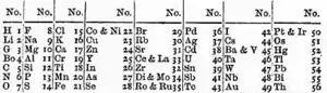 در سال ۱۷۸۹ آنتوان لاووازیه فهرستی از ۳۳ عنصر شیمیایی را منتشر کرد. او این عنصرها را زیر نامهای گازی، فلزی، نافلزی و خاکی دستهبندی کرده بود.[39] سپس در دههٔ ۱۷۹۰ یرمیا بنیامین ریشتر جدول وزن معادل را تهیه کرد. به این منظور، مقدار وزنی اسیدهایی که با یک مقدار مشخص باز ترکیب میشدند و نیز مقدار فلزهایی که با مقدار مشخصی اسید ترکیب میشدند را اندازهگیری کرد.[40] در سال ۱۸۲۹ یوهان ولفگنگ دوبرآینر دریافت که بسیاری از عنصرها را میتوان بسته به ویژگیهای شیمیایی آنها، در دستههای سهتایی بخشبندی کرد. برای نمونه لیتیم، سدیم و پتاسیم را با هم در دستهٔ فلزهای واکنشپذیر نرم گذاشت. همچنین او متوجه شد که وقتی عنصرها را به ترتیب وزن اتمی دستهبندی میکند، وزن عنصر دوم (میانی) تقریباً برابر است با میانگین وزن عنصر پیش و پس از خود (عنصر اول و سوم).[41] این پدیده به نام قانون سهتایی یا سهتایی دوبرآینر شناخته شد.[42] شیمیدان آلمانی لئوپولد گملین با همین روش ادامه داد و تا سال ۱۸۴۳ توانست ده دستهٔ سهتایی، سه دستهٔ چهارتایی و یک دستهٔ پنجتایی را شناسایی کند. در سال ۱۸۵۷ ژان باتیست آندره دوما توانست ارتباطهایی میان دستههای گوناگون فلزها به دست آورد. تا این دوره شیمیدانان گوناگون توانسته بودند ارتباطهای گوناگونی میان دستههای کوچک عنصرها به دست آورند؛ اما هیچیک جدول کلی ارائه نکردهبودند.[43]