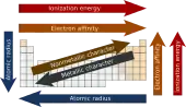 عنصرها در یک دوره همانندیهایی از لحاظ شعاع اتمی، انرژی یونش، الکتروندوستی و الکترونخواهی (مقدار انرژی آزاد شده هنگامی که یک الکترون به یک مولکول یا اتم خنثی افزوده میشود) از خود نشان میدهند. در یک دوره از چپ به راست، شعاع اتمی کاهش مییابد. این پدیده، به این دلیل است که با افزایش عدد اتمی در یک دوره، شمار لایههای الکترونی ثابت است، اما شمار پروتونها افزایش مییابد. برای همین الکترونها بیشتر به سوی هسته کشیده میشوند.[18] کاهش شعاع اتمی باعث افزایش انرژی یونش میشود (از چپ به راست). هرچه پیوندها در یک عنصر محکمتر باشد، انرژی بیشتری هم برای جداسازی یک الکترون نیاز است. الکتروندوستی مانند انرژی یونش رفتار میکند و از چپ به راست افزایش مییابد. چون کشش هسته بر روی الکترونها افزایش مییابد.[15] همچنین مقدار الکترونخواهی هم در طول یک دوره اندکی تغییر میکند. فلزها (عنصرهای سمت چپ دوره) معمولاً نسبت به نافلزها (سمت راست دوره) الکترونخواهی پایینتری دارند. این قانون برای گازهای نجیب برقرار نیست.[19]