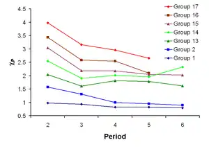 استثناهایی در تغییرات تناوبی الکترونگاتیوی مشاهده میشوند. الکترونگاتیوی عنصرهای گروه ۱۳ و ۱۴ در دورهٔ چهارم بیشتر از دورهٔ سوم است که دلیل آن، پر شدن لایهٔ d (که درونیتر است) و کمتر شدن شعاع اتمی است. استثنای دیگر، بالا بودن غیرعادی الکترونگاتیوی سرب در مقایسه با عنصرهای پیرامونش است که به نظر میرسد به دلیل اشکال در تحلیل دادهها باشد.[35] روشهای محاسباتی دیگر، متفاوت با آنچه مورد استفاده پاولینگ بوده، نشان میدهند که این عنصرها دارای رفتار دورهای طبیعی هستند.[36]