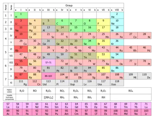 استاد روس شیمی، دیمیتری مندلیف و شیمیدان آلمانی، ژولیوس لوتار میر، هر یک به صورت مستقل جدولی را به ترتیب در سالهای ۱۸۶۹ و ۱۸۷۰ منتشر کردند.[57] جدول مندلیف، نخستین نسخه از کار او بود؛ درحالی که جدولی که میر منتشر کرد، نسخهٔ گسترش یافتهٔ جدول پیشین او بود که در سال ۱۸۶۴ منتشر کرده بود.[58] هر دو نفر، عنصرها را در ردیفها و ستونها به ترتیب وزن اتمی فهرست کرده بودند. در هر دو جدول در آغاز یک ستون یا ردیف، ویژگیهای عنصرها به صورت مرتب تکرار میشد.[59]