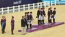 مراسم اهدای مدال مسابقات اسبسواری درساژ تیمی - از چپ به راست، آلمان (نقره)-بریتانیا (طلا)-هلند (برنز)