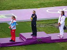 مراسم اهدای مدال مسابقات تیراندازی تراپ - از چپ به راست، اسلواکی (نقره)-ایتالیا (طلا)- فرانسه (برنز)