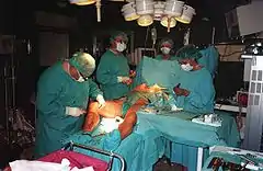 ![]() آغاز یک عمل جراحی بایپس عروق کرونر در جریان برداشت سیاهرگ از پا (سمت چپ تصویر) و ایجاد بایپس (قرار دادن کانول آئورت) (پایین تصویر). پرفیوژنیست و ماشین قلب -ریه در سمت راست بالا میباشد. | |