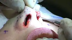 ![]() جراحی بینی: غضروف زیرین لایه ای بینی از سوراخ چپ بینی برای انجام تغییرات به بیرون کشیده شدهاست. | |
