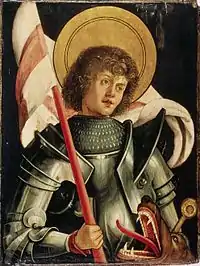 | نمادها | Clothed as a جنگهای صلیبی in plate armour or جوشن، often bearing a lance tipped by a cross, riding a white horse, often slaying a اژدها. In the Greek East and Latin West he is shown with St George's Cross emblazoned on his armour, or سپر or بنر. |