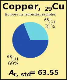 مس در منابع زمینی. دو ایزوتوپ دارد: مس-۶۳ (۶۲٫۹) و مس-۶۵ (۶۴٫۹)، در وفور ۶۹٪ + ۳۱٪ وزن اتمی استاندارد (Ar, standard) برای مس متوسط است، وزن آن به وفور طبیعی است و سپس بر اساس ثابت جرم اتمی m u تقسیم میشود. [1]
