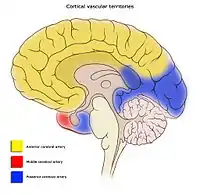 ![]() مناطق مغزی که توسط شریانهای مختلف تأمین میشوند. سیستمهای اصلی به گردش خون قدامی (شریان مغزی قدامی و شریان مغزی میانی) و گردش خون خلفی تقسیم میشوند. | |