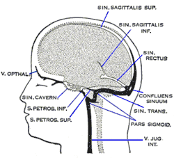![]() شماتیک از رگها و فضاهای وریدی که خون فاقد اکسیژن را از مغز تخلیه میکنند. | |