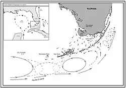 جریان فلوریدا نتیجه جابهجایی آبهای رانده شده از اقیانوس اطلس به دریای کارائیب بر اثر چرخش زمین است. این جریان در امتداد آمریکای مرکزی جریان یافته و از طریق تنگه یوکاتان وارد خلیج مکزیک میشود و پس از گرمشدن در خلیج مکزیک از طریق تنگه فلوریدا از این خلیج خارج میشود. جریان فلوریدا اغلب به اشتباه بهعنوان جریان گلف استریم شناخته میشود، در واقع جریان فلوریدا در شرق فلوریدا به گلف استریم میپیوندد.