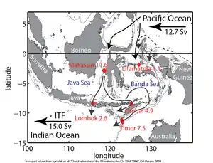 طرح شماتیک جریان میانگذر اندونزی. مقادیر جریان و گذرگاههای اصلی با رنگ قرمز مشخص شدهاند. آب از غرب اقیانوس آرام وارد جریان شده و در اقیانوس هند از آن خارج میشود.