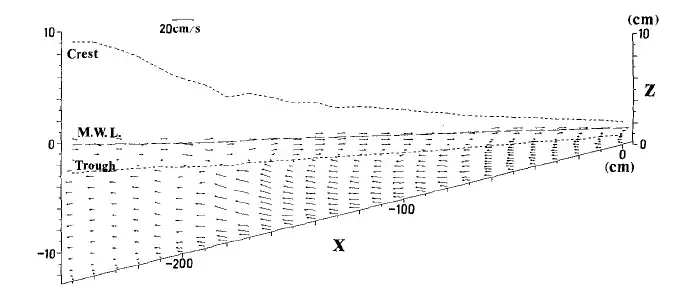به طور مشابه لانگت-هیگینز در ۱۹۷۵ میلادی نشان داد که موجهای پیشروندهٔ عمود بر ساحل، سرعت پاشنهٔ متوسطگیری شده در عمق و زمان با اندازهٔ زیر را ایجاد میکنند:[5]