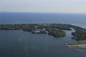 نمایی از جزایر تورنتو از برج سیان. این جزایر داخل بندر تورنتو را از باقی دریاچه انتاریو جدا میکند.