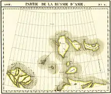 نقشهای از جزایر مربوط به سال ۱۸۲۰ میلادی. یکی از جزایر در آن زمان کشف نشده بود و یک قطعه خشکی هم به صورت جدا رسم شده بود.