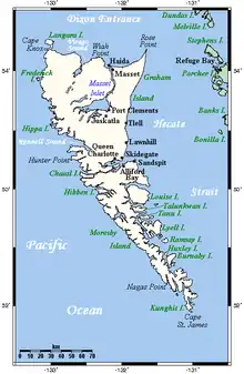 ![]() Haida Gwaii, off the coast of BC. Graham Island is the large northern island. Alaska is the next land to the north of this map. | |