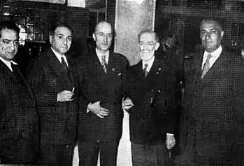 از راست به چپ: احمد پارسا، هانری ماسه، علیاکبر سیاسی، مهندس اشراقی و مجتبی مینوی