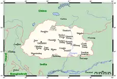 شهرهای مهم این کشور فونتشولینگ، پارودز، یاتونگ هستند قله جومولهاری با ارتفاع ۷۳۲۶ متر بلندترین قله این کشور در مرز مشترک با تبت