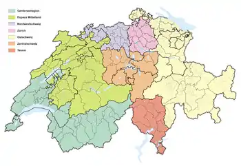 سوییس بهطور کلی به سه منطقه جغرافیایی تقسیم میشود: کوههای آلپ سوئیس، ناحیه «میتلاند»[3] یا فلات سوییس و کوههای ژورا در ناحیه شمالغربی و حوالی مرز فرانسه.