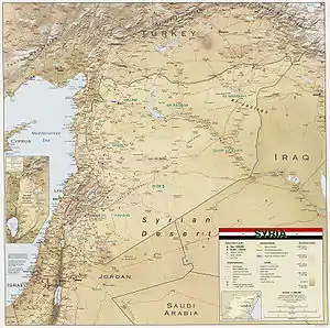 - مشارکتکنندگان ویکیپدیا. «Geography of Syria». در دانشنامهٔ ویکیپدیای انگلیسی، بازبینیشده در ۲۴ نوامبر ۲۰۱۵.
