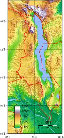 رودخانه شایر از انتهای جنوبی دریاچه به پایین دره کافتی میرود تا در جنوب به رودخانه زامبزی در موزامبیک بپیوندد. فلات و کوهها در شرق و غرب دره کافتی واقع شدهاند. فلات نییکا در غرب دریاچه مالاوی در شمال این کشور واقع شدهاست.