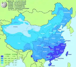 آب و هوای این کشور بسیار متنوع میباشد از مناطق گرمسیر و بارانی در جنوب تا بسیار سردسیر شمال را شامل میشود. طوفانهای موسمی (در حدود ۵ مورد در سال) در امتداد سواحل جنوبی و شرقی، سیلهای مخرب، سونامی، زلزله، رانش زمین و خشکسالی از بلایای طبیعی منطقه چین هستند.
