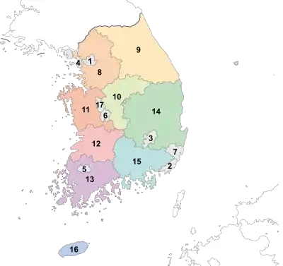 براساس آخرین تقسیمات کشوری کرهٔ جنوبی از ۹ استان و دو شهر ویژه تشکیل گردیده که زیر نظر فرماندار انتصابی دولت مرکزی اداره شده و مشخصات آن به شرح زیر میباشد: