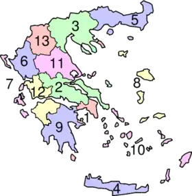 کشور یونان به ۱۳ ناحیه (به یونانی: Περιφέρειες، تلفظ: پـِریفِرئیـِس) تقسیم شدهاست. این ناحیهها نیز به نوبه خود به ۵۴ شهرستان تقسیم شدهاند.