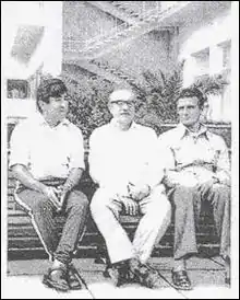 ![]() نویسندۀ تاجیک جلال اکرامی (میانه) و در دو سوی او دیگر نویسندگان تاجیک، بهرام فیروز (چپ) و مؤمن قناعت (راست). | |