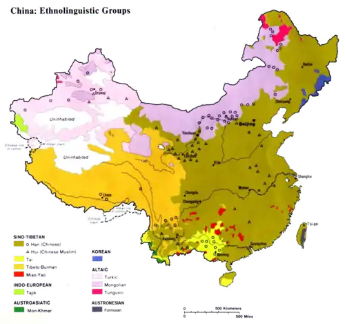 | اقلیت قومی | Zhuang, Manchu, Hui, Miao, Uyghurs, Yi, Tujia, Inner Mongols, Tibetan, Buyei, Dong, Yao, Korean, Bai, Hani, Li, Kazak, Dai, She, Lisu, Gelao, Lahu, Dongxiang, Va, Sui, Nakhi, Qiang, Tu, Xibe, Mulao, Kyrgyz, Daur, Jingpo, Salar, Blang, Maonan, Tajik, Pumi, Achang, Nu, Ewenki, Gin, Jino, De'ang, Uzbeks, Russian, Yugur, Bonan, Monba, Oroqen, Derung, Tatars, Hezhen, Lhoba |