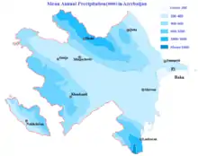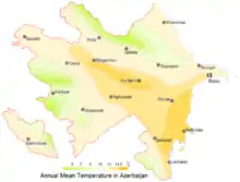 از لحاظ آب و هوایی، جمهوری آذربایجان دارای چندین نوع آب و هوای مختلف است. بهطوریکه از ۱۱ ناحیه آب و هوایی ۹ گونه ناحیه در آذربایجان وجود دارد.[30] درجه هوای متوسط در مناطق جلگهای شمال و شرق کشور تا ۶ سانتیگراد در زمستان و ۳۶ درجه سانتیگراد در تابستان میرسد، در حالیکه در مناطق کوهستانی غربی زمستانها تا ۹- در زمستان و ۱۲ درجه سانتیگراد در تابستان میرسد. پایینترین دمای مطلق در اردوباد به میزان ۳۳- درجه سانتیگراد و بالاترین دمای مطلق در جلفا به میزان ۴۶ درجه سانتیگراد ثبت شدهاست.[30] بهطور کلی شمال و شرق کشور دارای آب و هوای نسبتاً خشک و کوهستانی است در حالیکه منطقه جنوب شرقی آب و هوای مرطوب و ملایم تری دارد. مناطق غربی و شمالی و جنوبی شامل قره باغ و شمال شرقی جمهوری خودمختار نخجوان، دامنه کوههای قفقاز و ناحیه لنکران-آستارا و کوههای تالش بسیار مرطوب هستند. بیشترین میزان بارش سالانه در لنکران و به میزان ۱۶۰۰ تا ۱۸۰۰ میلیمتر و کمترین میزان بارش سالانه به میزان ۲۰۰ تا ۳۵۰ میلیمتر در آبشوران روی میدهد. مناطق مرکزی شامل جلگههای وسیع مستعد کشاورزی است که توسط رود کورا و ارس آبرسانی میشوند.
