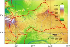 بیشتر این کشور فلاتی پست است در حدود ۵۰۰ متر بالاتر از سطح دریا، که در امتداد مرز سودان با کوههای بونگوس و در غرب با کوههای کاره مرتفع میگردد، در شمال شرق کشور تپهماهورهای حاصلخیز و در جنوب غرب نیز تپههای پراکنده قرار دارند.