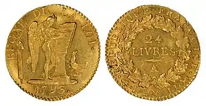 نگارهای از پشت و روی سکهٔ طلای ۲۴ لیور متعلق به دورهٔ جمهوری اول فرانسه.