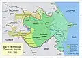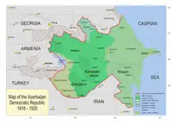 ![]() نقشه جمهوری آذربایجان تهیه شده برای کنفرانس صلح پاریس(۱۹۱۹)، شامل مناطق تحت مناقشه با گرجستان و ارمنستان است. | |||||||||