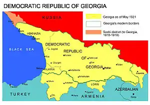 ![]() Actual boundaries of DRG in the beginning of 1921. (Democratic Republic of Georgia shown in yellow) | |||||||||||