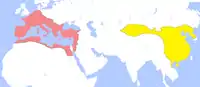 حوضۀ تاریم در سینکیانگ ۶۰ سال پیش از میلاد توسط سلسلۀ هان با عنوان قیومیت مناطق غربی و در سال ۶۴۰ میلادی توسط سلسلۀ تانگ با عنوان قیومیت عمومی برای آرام کردن غرب تحت کنترل چین بود. منطقهای که توسط چینیها ژیو (Xiyu) خوانده میشد به معنی مناطق غربی است. حوضۀ تورفان توسط مملکت قرهخواجه کنترل میشد.