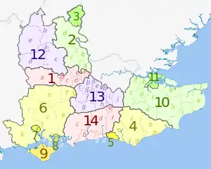 | ۱۴. ساسکس غربی | a) وورتینگ، b) Arun, c) Chichester, d) Horsham, e) کراولی، f) Mid Sussex, g) Adur | ||