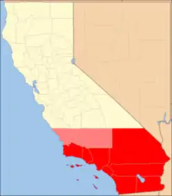 ![]() Red: The eight traditionally included counties. Light red: شهرستان سن لوییز اوبیسپو، کالیفرنیا و شهرستان کرن، کالیفرنیا counties in the expanded ten county definition. | |