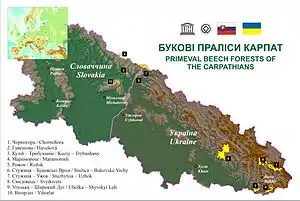 از مساحت کل که برابر با ۱۹۲،۶۷۲ هکتار است تنها ۷۲۳۵۰ هکتار از آن به عنوان منطقه حفاظت شدهاست و باقی منطقه به عنوان منطقه حائل در نظر گرفته شدهاست. بیش از ۷۰ درصد از سایت در اوکراین واقع شدهاست. این منطقه شامل دو پارک ملی و ذخیره گاه زیستکره است که بیشتر آن در اسلواکی قرار دارد و جنگلهای آلمان که ۴۳۹۱ هکتار را پوشش میدهد در سال ۲۰۱۱ به این منطقه اضافه شدهاست. این جنگل در فهرست میراث جهانی یونسکو به ثبت رسیدهاند.[1]