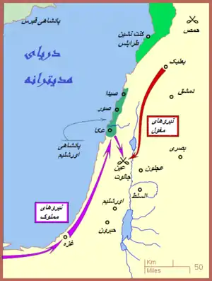 در سالهای پایانی صلیبیان که با خطر مملوکهای مصری مواجه بودند امید به اتحاد با مغولها بسته بودند. ایلخانان مغول تصور میشد که به مسیحیت نزدیکتر هستند و شاهزادگان فرانکی در چند مورد توانسته بودند مغولها را برای حمله به چندین ناحیه در خاورمیانه تحریک و سازماندهی کنند.[49] اگر چه مغولها تا دمشق تازشهای موفقیتآمیزی داشتند اما آنها نتوانستند به طرز مؤثری با صلیبیان در حمله به سرزمینهای مقدس هماهنگ شوند و در جنگها از مصریان شکست خوردند. بزرگترین شکست مغولان در جنگ تعیینکنندهٔ عین جالوت به سال ۱۲۶۰ م. رقم خورد. سرانجام مملوکها به رهبری بیبرس تصمیم خود برای پاکسازی شام از فرانکها را به تدریج عملی کردند. با سقوط انطاکیه (۱۲۶۸ م.)، طرابلس (۱۲۸۹ م.)، و عکا (۱۲۹۱ م.) مسیحیانی که قادر به فرار نبودند کشته یا به بردگی گرفته شدند و به این ترتیب آخرین آثار مسیحیت از شام ناپدید شد.[50][51]