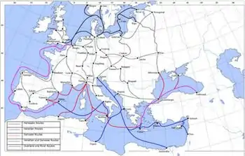 ![]() مسیر اصلی تجاری ونیز و جنوا. سیاه: هانزا، آبی: ونیز، قرمز: جنوا، بنفش: ونیزی و جنوایی، نقطهچین:مسیرهای زمینی | |||||||
