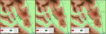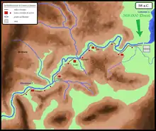 - وی لابینوس را با بخش بزرگی از سوارهنظام به گالیا بلجیکا در شرق، میان ترویرها[یادداشت 75] و رِمیها، فرستاد تا رسیدن نیروهای کمکی احتمالی ژرمن را سد کنند.