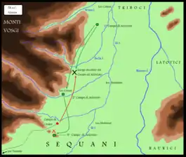 سزار مطلع شد که آریوویستوس از قلمروهای خود حرکت کرده و وسونتیوس (بزانسون امروزی، در نقشهٔ سفید با عنوان Vesontio) که مهمترین شهر سکوانها بود را هدف گرفتهاست. سزار که میپنداشت نمیتواند چنین امتیازی (شهر وسونتیوس) را به دشمن بدهد سرعت لژیونهایش را زیاد کرد و در کوتاهمدتی که ممکن بود راه را پیمود، و اینچنین موفق شد این شهر پادگانی[یادداشت 31] مهم را از جنگجوی ژرمن خود در امان بدارد. هنگامیکه این شهر توسط سزار اشغال شد و مواد ضروری برای ارتش خود را از آن برداشت کرد، یک پادگان را به حفاظت از آن گماشت.[41]