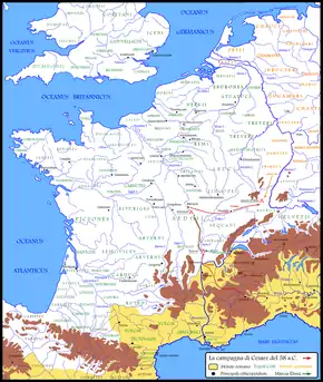 در پایان این عملیاتها، سرتاسر گالیا بلجیکا مشتملبر سرزمینهای نرویها، آتواتوکها، ویروماندوها، آترِباتیها و ابورونیها، تحت سیطره روم درآمدند. در این میان، لژیون هفتم تحت رهبری پوبلیوس لیکینیوس کراسوس (فرزند تریومویر، کراسوس) به غرب فرستاده شد تا قبایل مناطق ساحلی اقیانوس اطلس از جمله نرماندی و گارون امروزی را به انقیاد بکشاند[62][یادداشت 64] (مسیر حرکت او در نقشه با خط قرمز و نام P.Crasso e legio VII نشان داده شدهاست). یک لگاتوس (معادل رومی فرمانده) دیگر بهنام گالبا با لژیون دوازدهم و بخشی از سوارهنظام به سرزمینهای نانتواتها،[یادداشت 65] وراگریها،[یادداشت 66] و سدونیها[یادداشت 67] که میان قلمروهای آلوبروگیها، دریاچه ژنو، رود رون و آلپ بودند فرستاده شد.[63] قیصر هنگامیکه تمامی لژیونها را در اقامتگاههای زمستانی اتراق داد به ایتالیا بازگشت.[64] با عزیمت سزار، لگاتوس (یا ژنرال) گالبا که مأموریت داشت جادهٔ آلپ میان گالیا کوماتا و گالیا کیسالپینا را بگشاید، خود را ناچار به مواجه شدن با یک دشمنِ مشخصاً پرشمارتر دید و وادار شد روستای سلتی اوکتودوروس (امروزه مارتینی، سوئیس؛ در نقشه با عنوان Octodurus) که اردوگاه زمستانی خود را در آنجا برپا ساخته بود را رها کرده و به سرزمین دوست یعنی آلوبروگها عقبنشینی کند.[65]