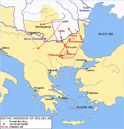 جنگ احتمالاً پس از آن آغاز شد که فیلیپ عرب، سلف امپراتور دقیانوس، از ادامه پرداخت یارانه سالانه به قبایل منطقه که توسط امپراتور ماکسیمینوس تراکس در سال ۲۳۸ در حالی که گرسنه بودند آغاز شد،[1] امتناع ورزید. گوتها توسط پادشاه Cniva سینوا هدایت میشدند که در سال ۲۴۹ یا ۲۵۰ با دو ارتش از دانوب عبور کرده بود. ستون اصلی سینوا با ۷۰٬۰۰۰ نفر بهطور ناموفقی به Novae حمله کرد و سپس در نبرد Nicopolis ad Istrumاز دقیانوس شکست خورد. سینوا به سمت Augusta Traiana فرار میکند دقیانوس او را تعیب میکند و در نبرد Beroe سنیوا پیروز میشود و قوای او شهر را غارت میکنند. دقیانوس ناچار میشود ارتش خود را به شمال بکشاند به فیلیپوپولیس (تراکیا) (پلوودیو در بلغارستان فعلی)[2] برود؛ و زمان زیادی را باقی گذاشته تا سینوا شهر موزیا Moesia را غارت کند. پس از غارت آن شهر گوتها نیز برای محاصره شهر فیلیپوپولیس به سمت جنوب حرکت کردند. نبرد فیلیپوپولیس در سالهای ۲۵۰ یا ۲۵۱ انجام شد و پس از مدتها محاصره شهر گوتها پیروز شدند. متعاقباً پادشاه سنیوا با فرمانده شهر و فرماندار تراکیه، تیتوس ژولیوس پریسکوس، بر علیه دقیانوس متحد شد. دقیانوس تجدید قوا میکند ولی نبرد ابریتوس در سال ۲۵۱ منجر به کشته شدن دقیانوس و پسرش هرنیوس اتروسکوس شد.