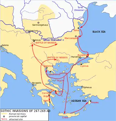 در طول «بحران قرن سوم» هنگامی که امپراتوری تقریباً سقوط کرد، بزرگترین حمله گوتیک در سال ۲۶۸ اتفاق افتاد. متحدان دریایی گوتها، هرولی، ناوگان حمل ارتشهای عظیم را در امتداد ساحل دریای سیاه تأمین کردند؛ و سرزمینهای ساحلی در تراکیه و مقدونیه را ویران کردند. نیروهای عظیم دیگر از رود دانوب در موزیا عبور کردند. حمله گوتها به استان پانونیا نیز تهدید به یک فاجعه بود. در سال ۲۶۸، امپراتور گالینوس پیروزیهای مهم اولیه ای را در خشکی و دریا بدست آورد، اما این جانشین او کلادیوس دوم بود که سرانجام در جنگ نایسوس در ۲۶۸ یا ۲۶۹ در یکی از خونینترین نبردهای قرن ۳ مهاجمان را شکست داد و متجاوزان متحمل سی تا پنجاه هزار کشته شدند.