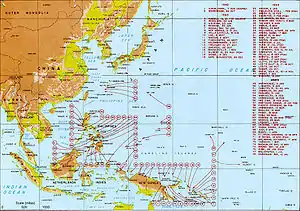 ![]() نقشهٔ مناطق اصلی درگیری و ورود نیروهای متفقین در اقیانوس آرام، ۱۹۴۵–۱۹۴۲. | |||||||||