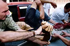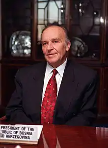 ![]() ساختمان شورای اجرایی در سارایوو (پایتخت بوسنی) در حال سوختن با آتش توپخانه در سال ۱۹۹۲ میلادی، راتکو ملادیچ در کنار دیگر افسران ارتش جمهوری صرب بوسنی، یک سرباز نروژی سازمان ملل متحد در سارایوو | |||||||||||
