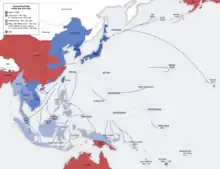 ژاپنیها برنامهریزی نموده بودند تا با تصرف سریع مستعمرات اروپایی در جنوب شرق آسیا یک خط دفاعی که تا میانه اقیانوس آرام ادامه میافت را ایجاد کنند چراکه پس از آن ژاپنیها میتوانستند منابع مورد نیاز خود را از جنوب شرقی آسیا استخراج نمایند و در عین حال به راحتی در برابر نیروهای متفقین که در سرتاسر اقیانوس آرام پراکنده شده بودند دفاع کنند.[173][174] مدتی بعد و برای جلوگیری از دخالت آمریکا در این طرح، ژاپنیها برنامه داشتند تا ناوگان اقیانوس آرام ایالات متحده را نابود نموده و آنها را از فیلیپین بیرون برانند.[175] در ۷ دسامبر ۱۹۴۱ (۸ دسامبر به وقت آسیا) جنگ اقیانوس آرام با تهاجم نیروهای ژاپنی به موقعیت نیروهای بریتانیایی و آمریکایی آغاز شد.[176] این لشکرکشی شامل حمله به پرل هاربر، فیلیپین، مالایا و تایلند[176] و نبرد هنگ کنگ بود.[177]