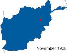 ![]() نقشه جنگ داخلی ۱۹۲۸–۱۹۲۹ افغانستان. سرخ = سقاویان، آبی= ضد سقاویان. این نقشه دخالت همزمان شوروی علیه باسماچیها در شمال افغانستان را نشان نمیدهد. | |||||||